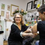 Mit schönem Wetter gesegnet und dem Glück schnell einen Parkplatz zu finden, freuten wir uns auf die heimische, gemütliche Atmosphäre und wurden nicht enttäuscht, auch wenn sich einiges getan hatte und wir in zwei neue Gesichter blickten. Alexander Ermakov aus St. Petersburg und Dirk Dunkel, den meisten besser bekannt als D.D. Tattoo. Bei unserer Ankunft waren beide auch schon mittendrin im Geschehen und der Andrang auf die noch freie Zeit der beiden Künstler war groß. Zeit für uns also sich gemütlich zu integrieren ins Getümmel und wie so oft dauert es nicht lange bis die ersten Gesprächsthemen und Tattoo-Ideen die Runde machen. Das wunderbare am Willicher Studio ist, das die Leute wie selbstverständlich kommen, keine Schüchternheit aufkommt und kein langes begutachten. Wer im Laden ist gehört zur Familie, fertig. Heimisch gut eben. Etwas später kam neben der Tattoo-Kunst natürlich noch die Piercing Queen Carmen vorbei, die fast jeder als Hole Lotta Love Piercing kennt. Kaum im Laden stand auch schon der erste Termin für die routinierte Piercerin an.